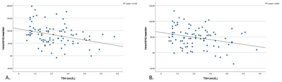 A negative correlation was observed between differences in thyroid density between post-contrast (e.g., arterial and venous) and non-contrast (TNC) densities and TSH levels. Figure 3 presents a scatter plot that illustrates the correlation between the changes in Hounsfield units (ΔHU, calculated as post-contrast minus TNC) in thyroid density and TSH levels. This is shown separately for arterial enhancement at 30 s (a) ΔHUa (R = −0.321, p = 0.002) and enhancement in the venous phase at 50 s (b) ΔHUv (R = −0.222, p = 0.039).