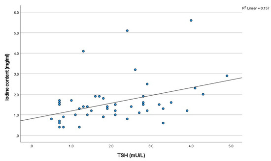 The scatter plot of the relationship between iodine concentration on TNC and thyroid function (TSH) (n = 48). TSH: thyroid stimulating hormone.