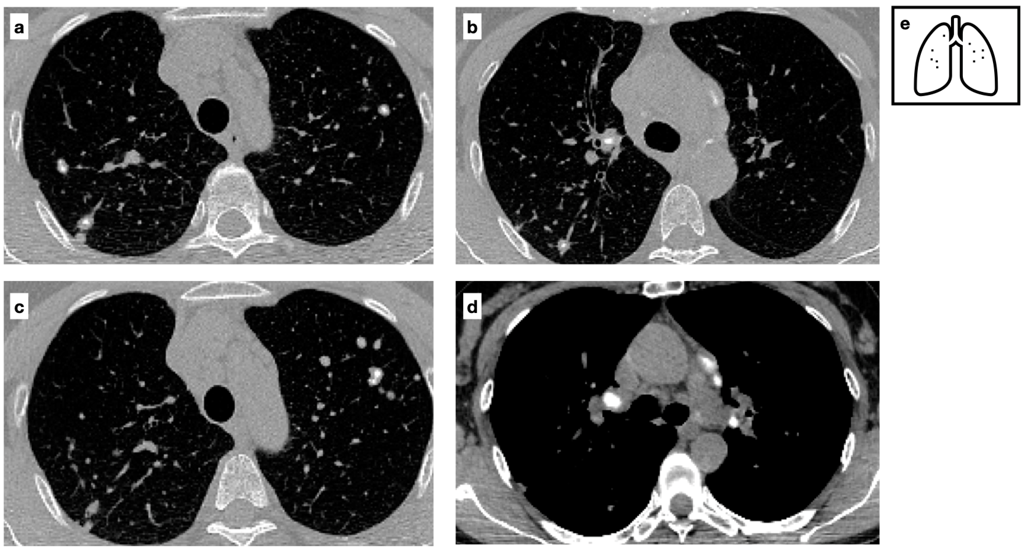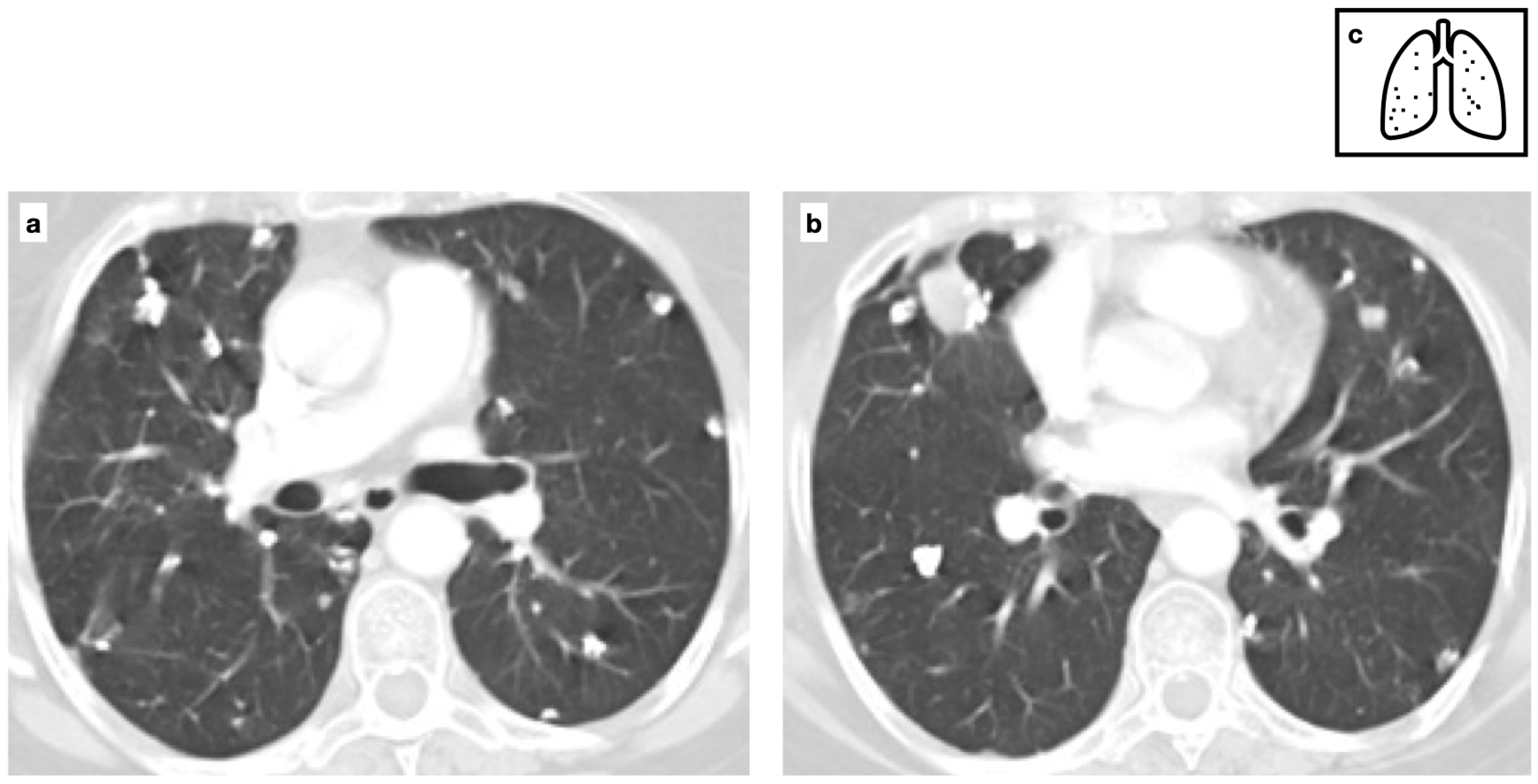 | Metastatic pulmonary calcifications | Benign etiologies: