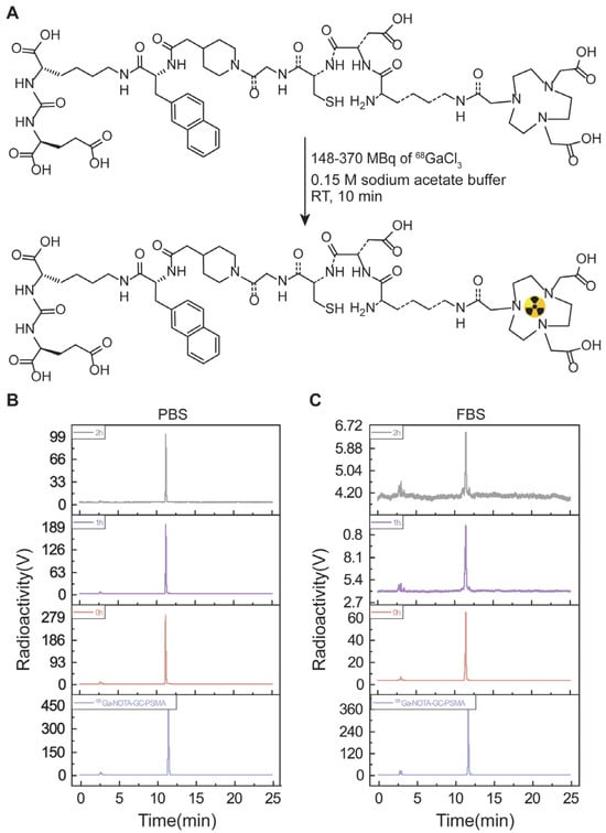 The labeling process and stability determination of 68Ga-NOTA-GC-PSMA. (A) 68Ga-NOTA-GC-PSMA. Stability of the 68Ga-NOTA-GC-PSMA in PBS (B) and FBS (C) with radio-HPLC.