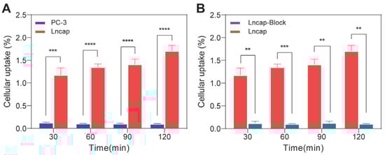 Cellular uptake and blocking assays. (A) LNCaP cells and PC-3 cells were incubated at 68Ga-NOTA-GC-PSMA for 30, 60, 90, and 120 min. (B) The LNCaP cell-blocking group was given an overdose of NOTA-GC-PSMA for 1 h pre-incubated and then incubated at 68Ga-NOTA-GC-PSMA for 30, 60, 90, and 120 min, and then measured by a γ-counter. The cellular uptake (%105 cells) is the percentage of cellular radioactivity in total input radioactivity. All data are means ± SD (** p < 0.005, *** p < 0.0005, **** p < 0.00005, n = 3).