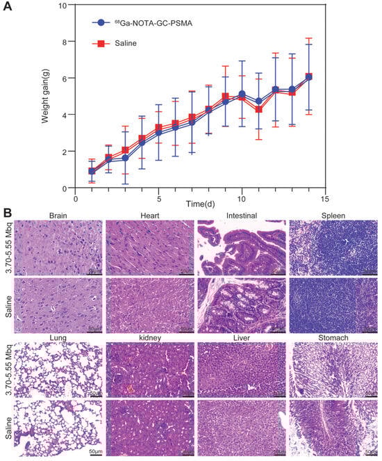 Radiotoxicity evaluation of 68Ga-NOTA-GC-PSMA (3.70–5.5 MBq/mouse) in ICR mice (n = 4/group). (A) Experimental and control groups were injected with 68Ga-NOTA-GC-PSMA and saline, respectively, and the body weight changes were observed for 14 consecutive days. (B) H&E staining results of major organs (brain, heart, liver, spleen, lungs, kidneys, small intestine, stomach) of mice in the 68Ga-NOTA-GC-PSMA and saline groups.
