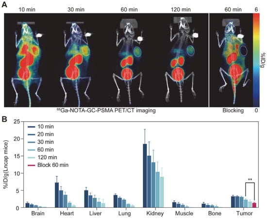 LNCaP tumor-bearing mice (n = 3/group) were injected with 68Ga-NOTA-GC-PSMA for micro-PET/CT imaging. (A) LNCaP tumor-bearing mice were injected with 68Ga-NOTA-GC-PSMA (3.0~5.5 MBq/mouse) and underwent micro-PET/CT imaging, and the blocking group was pre-injected with excess NOTA-GC-PSMA. (B) PET/CT images of LNCaP mice were outlined by PMOD software to quantify 68Ga-NOTA-GC-PSMA biodistribution in major organs and tissues. (** p < 0.005).
