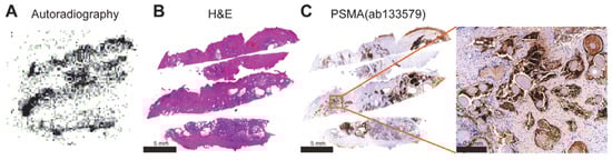 Adjacent slices were subjected to autoradiography (Figure 6A) with 68Ga-NOTA-GC-PSMA and subsequent staining (Figure 6B,C) to further investigate the correlation between the radioactivity distribution and PSMA expression (Figure 6C). As expected, the results showed the clustering of 68Ga-NOTA-GC-PSMA signals in the pathological sites with high PSMA expression, further confirming the targeting and specificity of this probe.