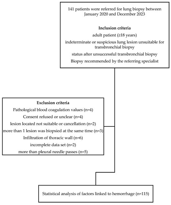Among the included participants, 67 were male (58%) and 48 (42%) were female. Sequential exclusion criteria were defined to minimize potential bias caused by significant physiological abnormalities in the pleural cavity or lung parenchyma (Figure 1). In emergency situations or when correction is unsuccessful (e.g., liver cirrhosis, aplasia), lung biopsies are often performed despite unfavorable blood values. Additionally, biopsies with multiple pleural penetrations or those targeting different lesions within the same session, as well as pleural infiltrative processes with potential neovascularization, were excluded due to the elevated risk of initial bleeding.