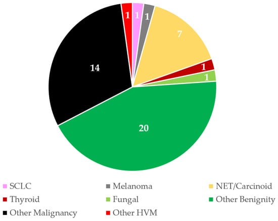 Histological findings of the lung biopsies. HVL = hypervascular lesions; other HVM = hypervascular metastasis like sarcoma; SCLC = small cell lung cancer; NSCLC = non-small cell lung cancer; HCC = hepatocellular carcinoma; NET = neuroendocrine tumor; RCC = renal cell carcinoma. Percentages are rounded. Metastases from breast cancer and RCC are not included in the pie chart as no cases were recorded.