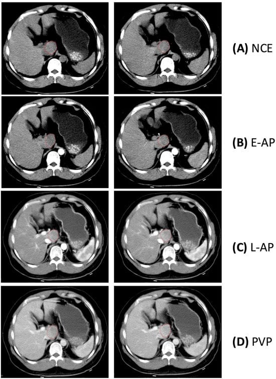 Given that lesion density can vary significantly across a dynamic CECT series (see Figure 2), the mean and SD of lesion density were calculated for each patient and compared across phases. Overall lesion density as well as phase-specific densities (NCE, E-AP, L-AP, and PVP) were computed and visualized using histograms and boxplots. In the phase-specific analysis, the mean density for each lesion was computed.