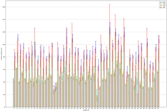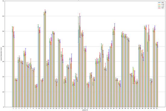 Figure 3B displays waterfall plots of the maximum relative change in diameter for each lesion across the four phases. Using the maximum percent changes for each patient in the NCE phase and E-AP, 15.7% (8/51) and 5.9% (3/51) of patients, respectively, would have met the modified RECIST threshold for disease progression. This proportion was much larger for the L-AP and PVP, where 52.9% (27/51) and 51.0% (26/51) of patients, respectively, would have met the same criteria. No patients met the modified RECIST threshold for treatment response in the NCE phase, L-AP, and PVP, and only one patient met the threshold in the E-AP. Figure 4 shows the average lesion sizes (mm) measured by phase for each patient. As shown in the graphs, there is no significant difference between lesion size measurements across the four phases given the overlap of the standard error bars for each lesion.