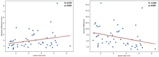 Lesion sizes were further stratified into size ranges (1–2 cm, 2–3 cm, 3–5 cm, and 5–7 cm), and the mean lesion size, CV, and corresponding SD were computed for each lesion per group. Pearson’s correlation coefficients were used to evaluate the relationship between lesion size and the percent difference in measurements.