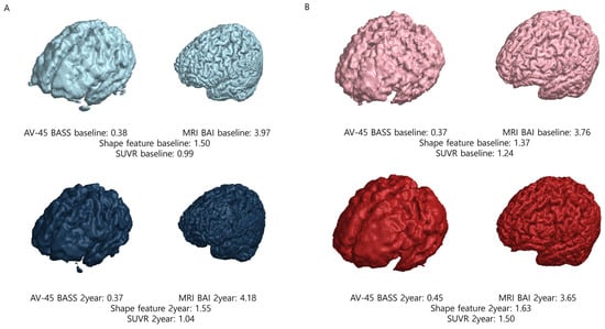 Representative examples of nonconverter and converter patients. (A) In nonconverter patients, the shape feature at baseline was 1.50; at the 2-year follow-up, the shape feature was 1.55, demonstrating a percent change of 0.033. (B) In converter patients, the shape feature at baseline was 1.37; at the 2-year follow-up, the shape feature was 1.63, demonstrating a percent change of 0.190. Abbreviations: SUVR, standardized uptake value ratio; AV-45, F-18 florbetapir; BASS, brain amyloid smoothing score; BAI, brain amyloid index.