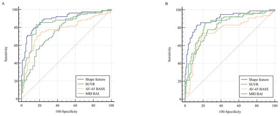 Comparison of ROC curves for shape features, SUVR, AV-45 BASS, and MRI BAI at (A) baseline and (B) 2-year follow-up. The shape feature exhibited the highest AUC value in both (A) and (B). The red diagonal line represents the chance level (random guessing) in the ROC curve. Abbreviations: ROC, receiver operating characteristic; SUVR, standardized uptake value ratio; AV-45, F-18 florbetapir; BASS, brain amyloid smoothing score; BAI, brain amyloid index; AUC, area under the curve.