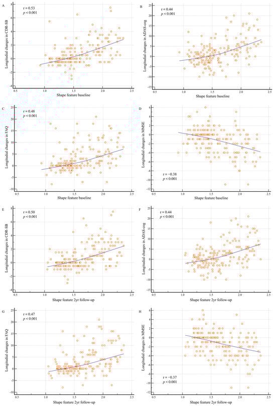 Baseline shape features and 2-year follow-up shape features computed from baseline PET and MR images of patients with MCI showed significant correlations with longitudinal changes in cognitive measures at 2 years (Figure 3). The baseline shape feature exhibited a positive correlation with longitudinal changes in CDR-SB (r = 0.53; p < 0.001), ADAS-cog (r = 0.44; p < 0.001), and FAQ (r = 0.48; p < 0.001), in addition to a negative correlation with longitudinal changes in MMSE scores (r = −0.38; p < 0.001). In addition, the 2-year follow-up shape feature revealed a positive correlation with the longitudinal changes in CDR-SB (r = 0.50; p < 0.001), ADAS-cog (r = 0.44; p < 0.001), and FAQ (r = 0.47; p < 0.001), in addition to a negative correlation with longitudinal changes in MMSE scores (r = −0.37; p < 0.001).