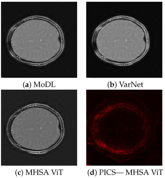 The quality scores demonstrate the strengths of the ViT network across multiple metrics. The triply augmented ViT achieves a respectable SSIM score while outperforming both VarNet and MoDL in terms of NRMSE and PSNR. Notably, the ViT results have better NRMSE and PSNR scores even with little or no augmentation to the training data. These result suggest that the ViT excels at preserving pixel intensity fidelity and reducing reconstruction noise. However, the lower NMI score indicates room for improvement in capturing fine inter-pixel relationships, particularly in regions of high structural complexity. Augmentation improves performance, with higher PSNR values demonstrating reduced noise and enhanced clarity. The lower Shannon entropy score for ViT suggests that a lesser amount of redundant information has been added during reconstruction. Likewise, the EFC scores indicate superior clarity for the ViT pipeline. Figure 3 illustrates sample triply augmented MHSA ViT results from the network. Figure 4 shows the same image reconstructed by VarNet, MoDL, and ViT pipeline; the final subfigure shows the amplified difference between the PICS and ViT reconstructions.