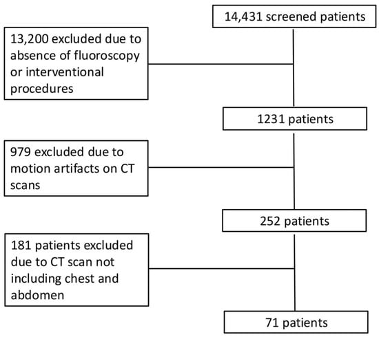 The inclusion process for patients in the study is shown in Figure 1. After exclusion, we included 71 patients (Table 2) who underwent 2847 radiological examinations, including 2472 X-ray films (87%), 270 contrast-enhanced CT scans (9%), and 106 fluoroscopy and interventional radiology procedures (4%). Patients underwent CT of different body regions: 19 underwent chest CT (n = 10 unenhanced CT and after iodinated contrast injection during the arterial phase, n = 9 unenhanced CT and contrast-enhanced CT in both arterial and portal venous phases), 20 abdominal CT (n = 12 unenhanced CT and after iodinated contrast injection during the arterial phase, n = 8 unenhanced CT and contrast-enhanced CT in both arterial and portal venous phases), and 32 chest and abdominal CT (n = 12 unenhanced CT in arterial phase, n = 20 unenhanced CT in both arterial and portal venous phases).
