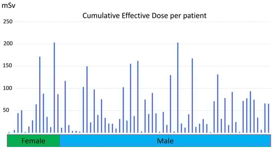 Figure 2 shows the cumulative effective dose distribution according to sex. The median cumulative effective dose per patient was 38.82 (IQR, 17.34–84.64) mSv. Male patients were exposed to a higher median cumulative effective dose than female patients (37.59 [IQR, 17.6–78.01] vs. 44.11 [IQR, 14.19–86.85]).
