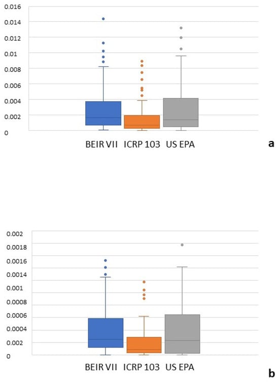 Figure 3 shows the all-cancer and leukemia risk distribution according to different risk models. A significant correlation was observed between all risk models (r = 0.71–0.97, p = 0.001) (Figure 4) and Bland–Altman analysis showed negligible bias (mean difference, −0.001–0.004) (Figure 5). Different organ, leukemia, and all-cancer risk values (Table 3) were significantly different, but the ICC revealed good or even excellent inter-model consistency in risk values. The ICRP 103 model indicated a lower all-cancer and leukemia risk compared to the US EPA and BEIR VII models (Table 3). Both the BEIR VII and ICRP 103 models indicated higher all-cancer risk in females, whereas the US EPA model showed higher all-cancer risk in males (Table 4). ICRP 103 showed a higher leukemia risk in females, whereas BEIR VII showed a higher leukemia risk in males (Table 4).