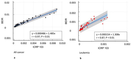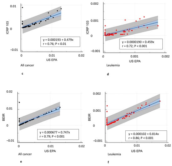 Correlation analysis between different risk models. (a) All-cancer risk (black dots) in BEIR VII vs. ICRP 103, (c) ICRP 103 vs. US EPA, and (e) BEIR VII vs. US EPA risk models. (b) Leukemia risk (red dots) in BEIR VII vs. ICRP 103, (d) ICRP 103 vs. US EPA, and (f) BEIR VII vs. US EPA risk models. A significant correlation was observed between all risk models (r = 0.71–0.97, p ≤ 0.0001).