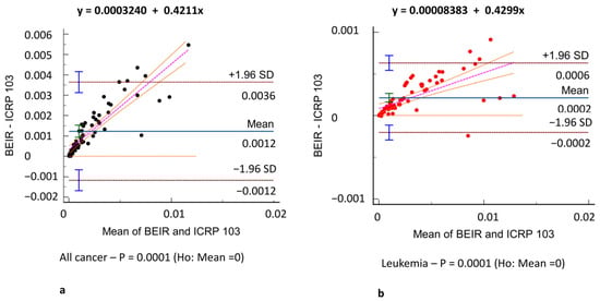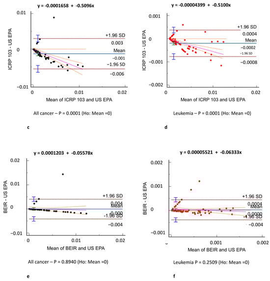Agreement assessment according to the Bland–Altman analysis between different risk models. (a) All-cancer risk (black dots) in BEIR VII vs. ICRP 103, (c) ICRP 103 vs. US EPA, and (e) BEIR VII vs. US EPA risk models. (b) Leukemia risk (red dots) in BEIR VII vs. ICRP 103, (d) ICRP 103 vs. US EPA, and (f) BEIR VII vs. US EPA risk models. The difference in the estimated risks is on the y-axis and the mean of the two model estimated risks is on the x-axis. Comparisons revealed very low bias (mean difference: −0.001–0.004) in both all-cancer (e) and leukemia risk (f) agreement.