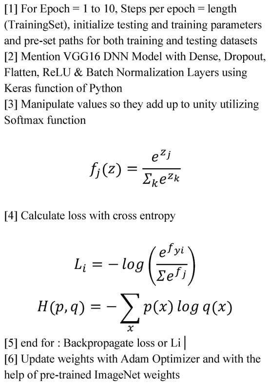 Cross-entropy loss function—SoftMax is usually paired with the cross-entropy loss function in the training phase of CNNs. Cross-entropy measures the dissimilarity between the predicted probabilities and the true distribution of the classes. SoftMax, by producing a probability distribution, aligns well with the requirements of the cross-entropy loss function. We exploited this function after utilizing the SoftMax function, whereby our goal was to foresee our network’s performance and, by functioning to decrease this mean squared error, we would be practically optimizing our network. This is represented as follows (both equations are different forms of the same loss function equation):