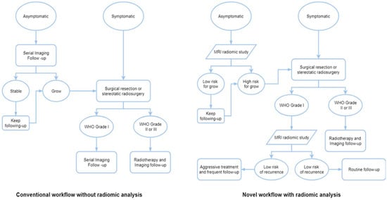Because of the subtle differences in diagnosis, risk assessment, and treatment strategy of meningioma, it is a great oncologic model system for studying the use and development of radiomics in cancer care today [,,]. Traditionally, the World Health Organization (WHO) grading system has guided clinical decision-making for meningiomas []. Though some high-grade meningiomas show indolent behavior and may not recur, this grading scheme occasionally reveals significant diversity in tumor behavior, with over 20% of low-grade meningiomas having an early recurrence [,,,]. This has raised interest in treating patients based on their molecular traits and growth rates [,,,]. Molecular platforms and testing are not always available, they incur additional costs, and they could only be able to detect a portion of a heterogeneous tumor in practice [,]. On the other hand, physicians who treat brain tumors have significantly easier access to imaging. Therefore, if image-based phenotyping can reach high reliability and reflect the biological characteristics and genetic signature of tumors, it has the potential to completely change the way patients can receive precision care.