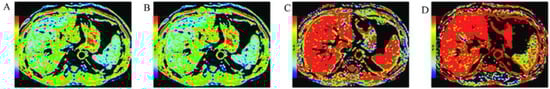 58-year-old man with mild fibrosis (stage 1) and hepatitis (grade 1). Illustration of (A) apparent diffusion coefficient; (B) real diffusion coefficient; (C) pseudo-diffusion coefficient; and (D) perfusion fraction. This figure was taken from Figure 1 in Lesheng Huang et al.’s study [].