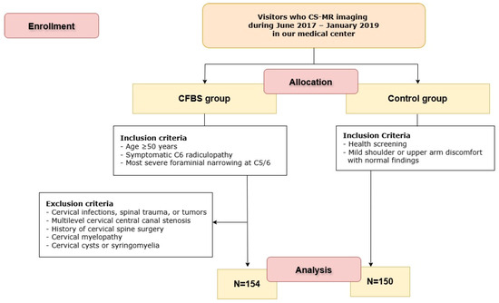 Flow diagram of the study. CS-MR CFBS = cervical spine magnetic resonance imaging; CFBS = cervical foraminal bony stenosis.