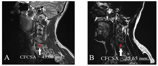 Measurement of the cervical foraminal cross-sectional area on CS-MR at C5/6 stenotic level: (A) control group; (B) cervical foraminal stenosis group.