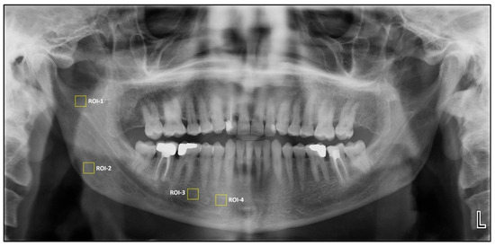 Square regions of interest (ROIs) of 64 × 64 pixels were selected owing to their frequent use in previous studies [13]. Four square ROIs were then placed on the right side of the mandible for fractal dimension and histogram-based pixel intensity analyses performed on dental panoramic radiographs. ROI1 was defined at the geometric center of the area between the mandibular notch and the mandibular foramen. ROI2 was positioned in the supracortical region superior to the mandibular angle. ROI3 was placed distal to the apex of the second premolar, carefully avoiding the mandibular canal’s cortical borders, periodontal ligament space, lamina dura, and root apices. ROI4 was located anterior to the mental foramen, excluding adjacent anatomical structures.