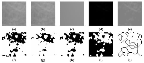 Steps of fractal dimension analysis. (a), The selected ROI from panoramic radiographs was cropped and (b), duplicated. (c), Gaussian blur filter was applied on duplicated image. (d), The blurred image was subtracted from the original image. (e), Addition of a gray value of 128 to each pixel location. (f), Binarization (g), Erosion (h), Dilation (i), Inversion (j), The skeletonized image was used for fractal dimension analysis.