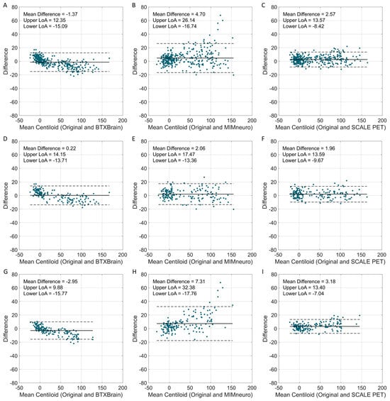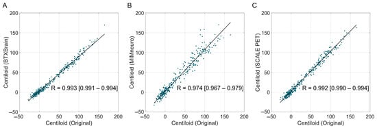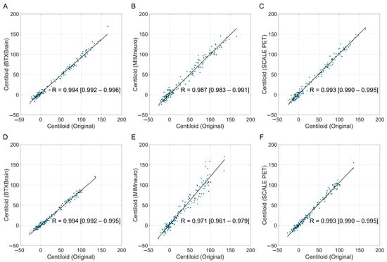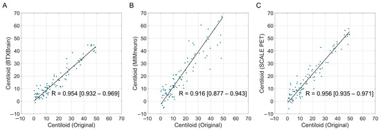 3.3. The Agreement of Software-Based Centiloid with the Original Method According to Centiloid Levels