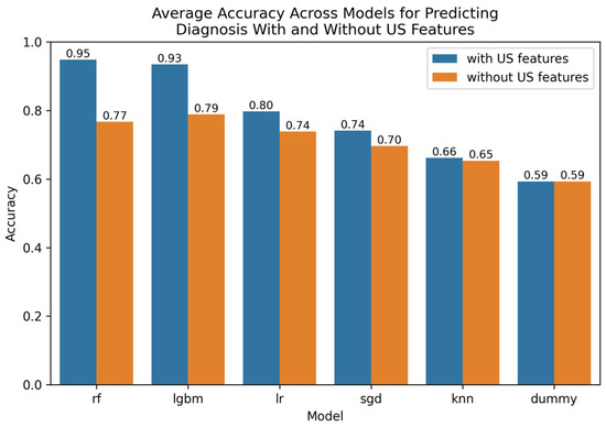 Comparative bar plot of leading models for predicting diagnosis with and without US features.