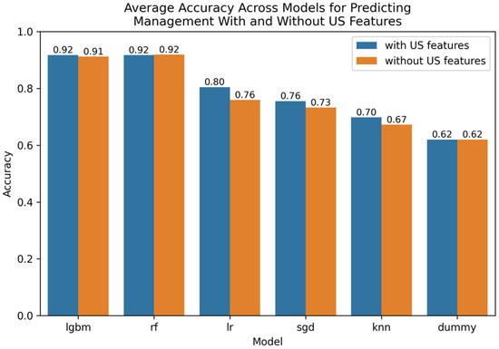 Comparative bar plot of leading models for predicting management with and without US features.