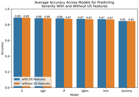 Comparative bar plot of leading models for predicting severity with and without US features.