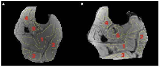 Transverse image of the lower leg of a young (A) and senior (B) subject with typical regions of interest manually contoured in the soleus (1), medial gastrocnemius, MG (2), lateral gastrocnemius, LG (3), tibialis anterior, TA (4), and tibialis posterior, TP (5). Care was taken to limit the ROI to the inside of the muscle borders and to avoid major fascicles.