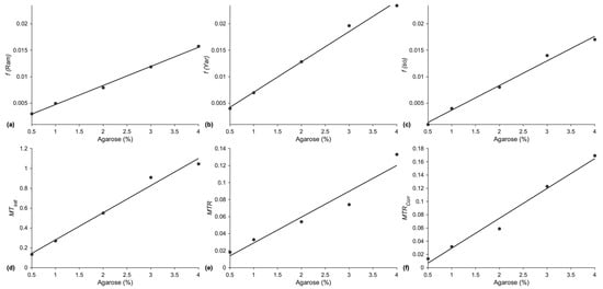 Macromolecular fractions and MTC indices as a function of % agar concentration (dilled circles are data points, the solid line is a linear fit). (a) f from multi-offset data fits to the Ramani model, f(Ram) (R2: 0.998, p = 5.4 × 10−5), (b) f from multi-offset data fits to the Yarnykh model, f(Yar) (R2: 0.993, p = 2.5 × 10−4), (c) f from single-offset data f(so) (R2: 0.990, p = 4.2 × 10−4), (d) MTsat (R2: 0.984, p = 8.8 × 10−4), (e) MTR (R2:0.941, p = 6.2 × 10−3), and (f) MTRcorr (R2: 0.981, p = 1.1 × 10−3).