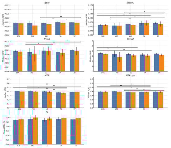 Bar plots of the macromolecular fraction (f(so), f(Ram), f(Yar)), qMT indices (MTsat, MTR, MTRcorr), and T1 are shown for young (blue bars) and old (orange bars) subjects for each muscle region. The significant differences between muscle regions are shown above the horizontal lines with ‘*’ (p < 0.05) or ‘**’ (p < 0.001). Age-related significant differences were seen in all MT indices and T1 except for f(Ram) and f(Yar); Table 2 lists details of the age-related differences. No significant differences in muscle regions were seen in the T1 values.