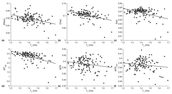 Pearson’s correlation coefficient and p-values for each MT sequence are based on the linear fits shown here. f(Ram) (r = −0.4, p = 5.86 × 10−6) (a), f(Yar) (r = −0.44, p = 5.81 × 10−7) (b), f(so) (r = −0.39, p = 8.26 × 10−6) (c), MTsat (r = −0.51, p = 3.49 × 10−9) (d), MTR (r = −0.19, p = 0.036 (r = −0.51, p = 3.49 × 10−9)) (e), MTRcorr (r = −0.14, p = 0.13) (f).