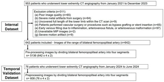 This retrospective observational study was approved by the institutional review board (No. 2024-07-002). Given its retrospective design, the requirement for written informed consent was waived. The internal dataset of this study included 953 out of 1122 patients who underwent lower extremity CTA at Hallym University Sacred Heart Hospital between January 2021 and December 2023, specifically selecting those who had CTA with maximum intensity projection (MIP) images. Exclusion criteria were applied as follows: poor image quality due to inadequate contrast agent injection resulting from compromised cardiac function or outdated imaging equipment; severe metal artifacts from prior surgeries impairing vessel assessment; incomplete imaging of the full length of the lower limb; scans performed after vascular interventions such as bypass grafting or stent insertion; and cases with early venous filling due to inflammation, arteriovenous fistulas, or arteriovenous malformations (Figure 1). To validate the proposed methodology, a temporal validation dataset was compiled using the same selection criteria, consisting of 76 patients examined from January to June 2024.