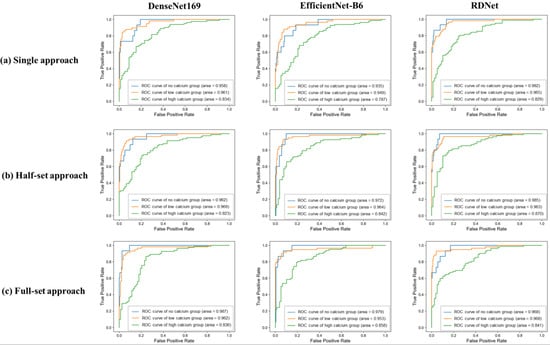 Receiver operating characteristic (ROC) curves of three deep learning models according to the degree of calcification in three approaches. In the single-image approach using only the frontal MIP image, both DenseNet169 and RDNet showed a decreasing trend in AUC with increasing calcium grade. EfficientNet-B6 showed a slight increase in AUC for the low calcium group, but the lowest AUC was observed in the high calcium group. In the half-set approach, both EfficientNet-B6 and RDNet showed a decreasing trend in AUC with increasing calcium grade, while DenseNet169 showed a slight increase in AUC for the low calcium group, but the lowest performance for the high calcium group. In the full-set approach, all deep learning models showed a consistent trend of decreasing AUC with increasing calcification.