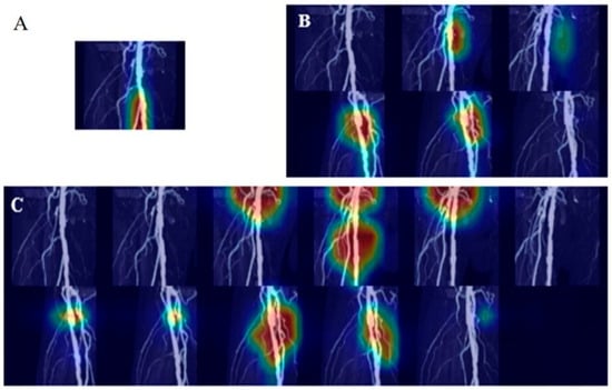 Recently, various artificial intelligence (AI)-assisted diagnostic systems have been developed and implemented in clinical practice, demonstrating high performance in radiology. However, research focusing specifically on peripheral artery stenosis using CTA remains limited [9]. Previous studies have developed AI models using CTA axial or magnetic resonance (MR) images [10,11], but very few studies have explored the use of MIP images [12,13]. One prior study developed a vision transformer model on MIP images and reported an accuracy of 71% using a small number of images; in contrast, our work utilized a dataset with more than 400-fold greater number of images [13]. Utilizing MIP images may offer advantages such as eliminating the need for bone removal, providing clearer vessel visualization, and enabling more effective detection and segmentation of vessels with fewer image slices [14]. If deep learning-based AI could assist radiologists by pre-selecting the presence and location of significant stenotic lesions on MIP images from lower extremity CTA, it could reduce radiologists’ workloads, shorten interpretation times, and ultimately contribute to the early detection and improved treatment outcomes for PAD and ALI.