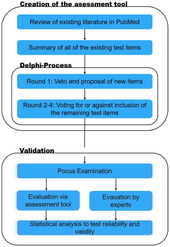 For the creation of the assessment tool in this single-center observational study, a literature review was conducted to identify suitable items. These items then underwent a Delphi process for the creation of the assessment tool. Secondly, the tool was used to grade POCUS performers and tested for its reliability and validity (Figure 1).