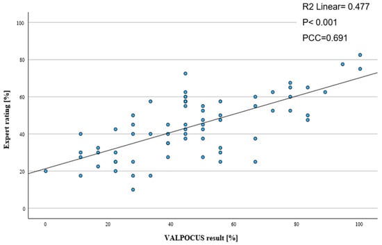 After adjusting internal consistency of the test, mean ratings of the assessment tool and expert opinion were compared. We were able to show that there was only a minimal difference between overall mean results. For the adjusted assessment tool, we calculated a mean score of 46.9% (±23.18%), and for the expert ratings, the mean score was 44.29% (±16.42%), suggesting reasonable validity. To examine validity, the result of each test performed by an examiner using the tool was correlated with the respective expert rating (Figure 2). Pearson’s correlation coefficient was calculated at 0.691 (R2 = 0.477; p < 0.001), indicating a moderate correlation between the assessment tool scores and expert ratings.