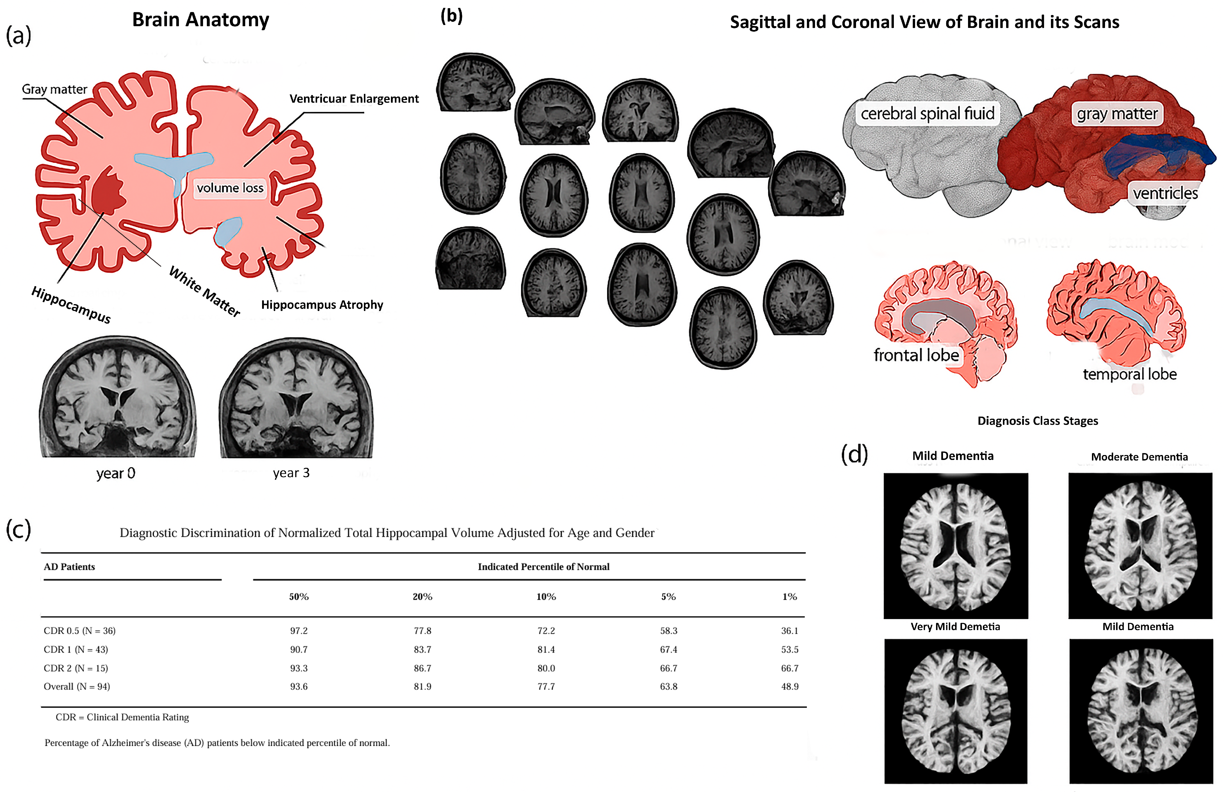 Figure 1, where the role of MRI data in multi-stage AD classification should be emphasized. These neuroanatomical alterations are associated with the development of AD from a very mild to a moderate stage. Decreases in the size of the hippocampus can be observed at the initial stages, and the further stages feature significant ventricular widening and cortical atrophy. Such patterns can help deep learning models to distinguish between healthy aging, MCI, and AD, providing the possibility of a scalable and objective staging of diseases [