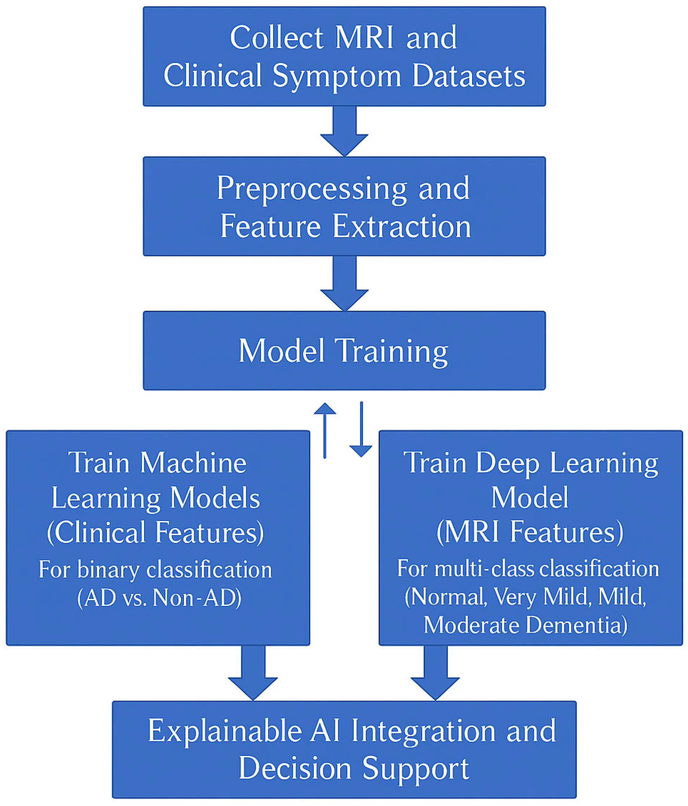 43]. Implementing an explainable AI method, the authors recently created an integrated model that combines MRI-based feature extraction with cognitive screening data, maintaining a high degree of accuracy and interpretability. This addition highlights the continued importance of multimodal methods in Alzheimer’s diagnosis. A more comprehensive and in-depth understanding of the disease’s history and dynamics may result from combining neuroimaging biomarkers with clinical and cognitive data. Better models for diagnosis will be established with the aid of this kind of dual-modal system, which will also make the model more transparent and reliable in clinical settings. In keeping with these advancements, our study emphasizes the ongoing and complementary significance of MRI-derived feature and symptom data and demonstrates how merging both data inputs could enhance model robustness and clinical relevance in more practical clinical decision-making scenarios. While we stress that improving model reliability, generalizability, and interpretation in clinical research is the foundation of diagnostic studies, future research will focus on ways to further optimize multimodal data, then expand its use, and establish ways to integrate modes [