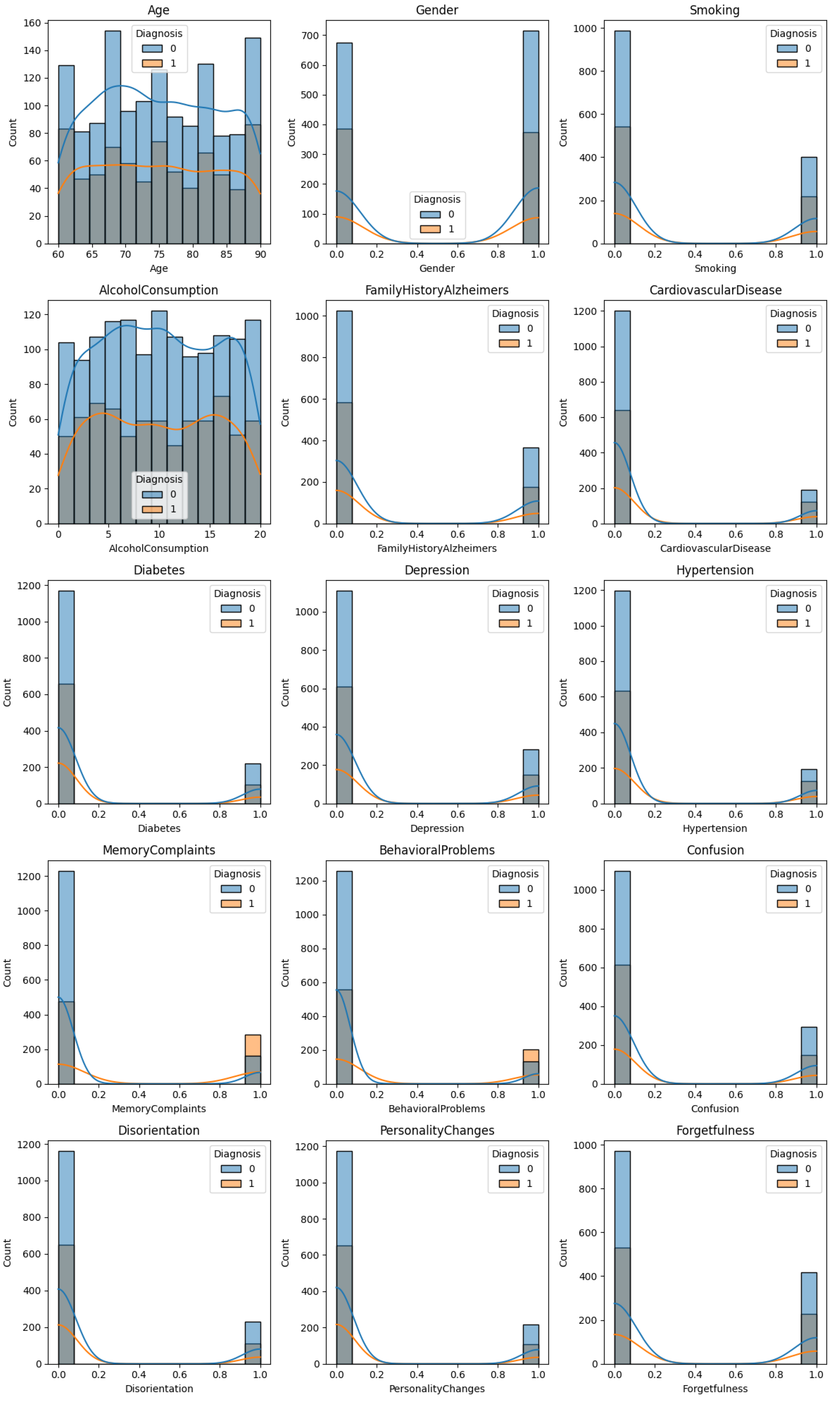 A supervised machine learning framework was adopted based on more detailed clinical data containing initial manifestations of the disease, with the help of which it was possible to identify Alzheimer’s in the early stages. This information included a range of cognitive and demographic variables, especially age, scores of MMSE, memory and disorientation, family history, and other diagnostic factors. Those characteristics have been clinically shown to be associated with Alzheimer’s disease development and were used due to their predictive capabilities in two-category classification: Alzheimer’s disease and non-Alzheimer’s disease. To obtain informal conclusions about the dataset, an exploratory data analysis (EDA) was performed by displaying the distribution of each feature with graphical models. For this purpose, the clinical features were prepared for graphical visualization as follows.