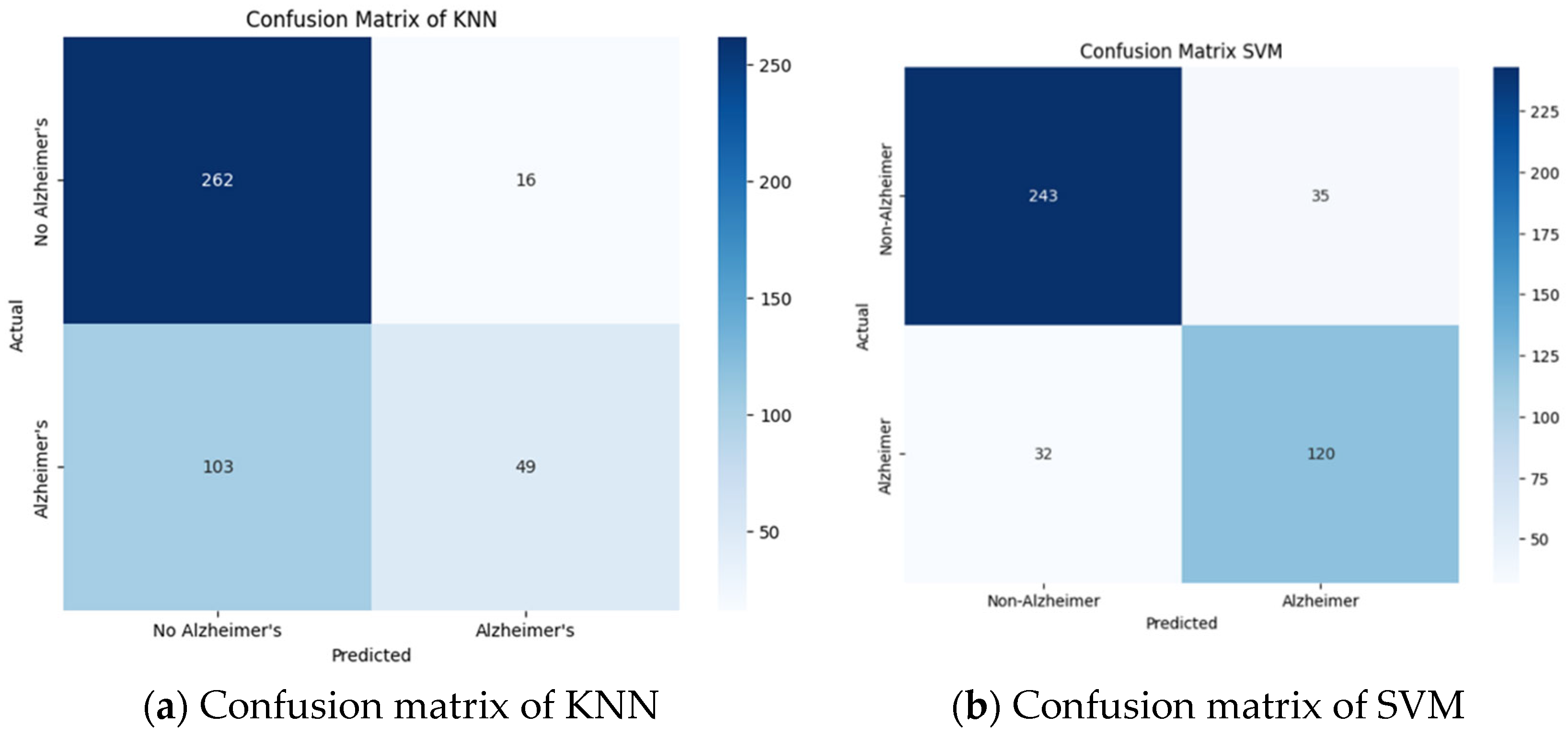 Figure 6a) failed to classify many Alzheimer-positive cases, implying that it has lower sensitivity in the initial stages of the disease, where the indications overlap to a large extent with normal aging.