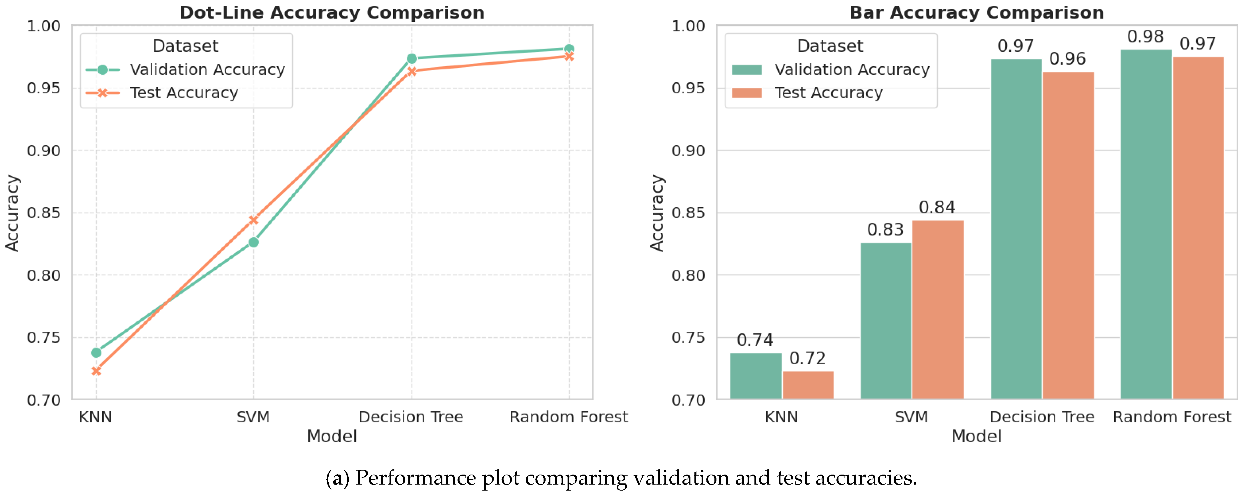 Random Forest presented the highest accuracy of 97% on test data, with Decision Tree at 96%, thereby ranking the second highest in accuracy. Such high performance is attributable to the fact that they are capable of dealing with non-linear connections between clinical characteristics. SVM, with an accuracy of 84%, presented moderate classification strength, whereas KNN had an accuracy of 72%, with a simpler but clinically significant foundation to entail a swift first screening. The small difference between validation and test accuracies of all models demonstrates proper generalization and decreases the risk of overfitting, improving their potential for clinical deployment.