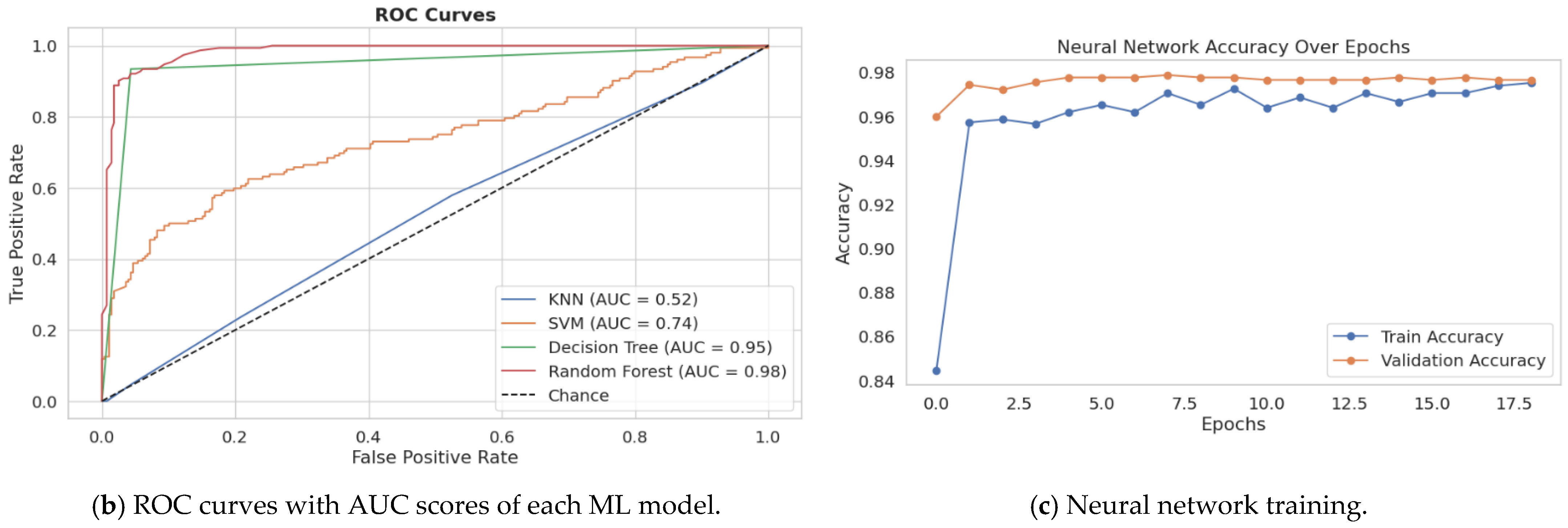 Figure 7c), where Random Forest and Decision Tree produced AUCs of 0.98 and 0.95, respectively, an indication of near perfection. The AUC of 0.74 for SVM suggests moderate discriminability, whereas the 0.52 of KNN is close to random chance, which underlines the utility of sophisticated classifiers in mild symptom discrimination.