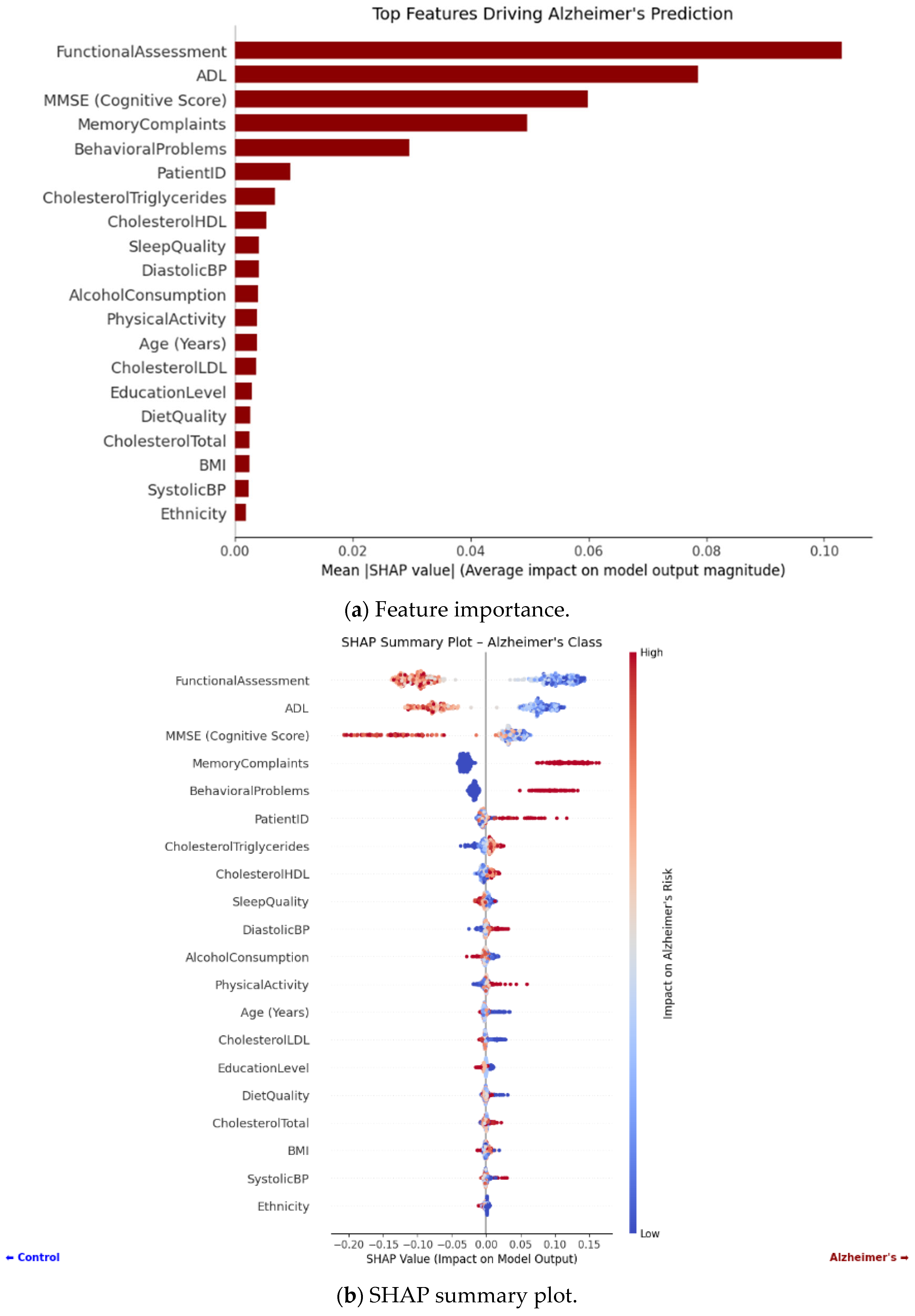 Figure 8a), Functional Assessment, ADL, MMSE score, and memory complaints emerged as the most important predictors and correspond with diagnostic criteria. The plot with detailed outcomes (