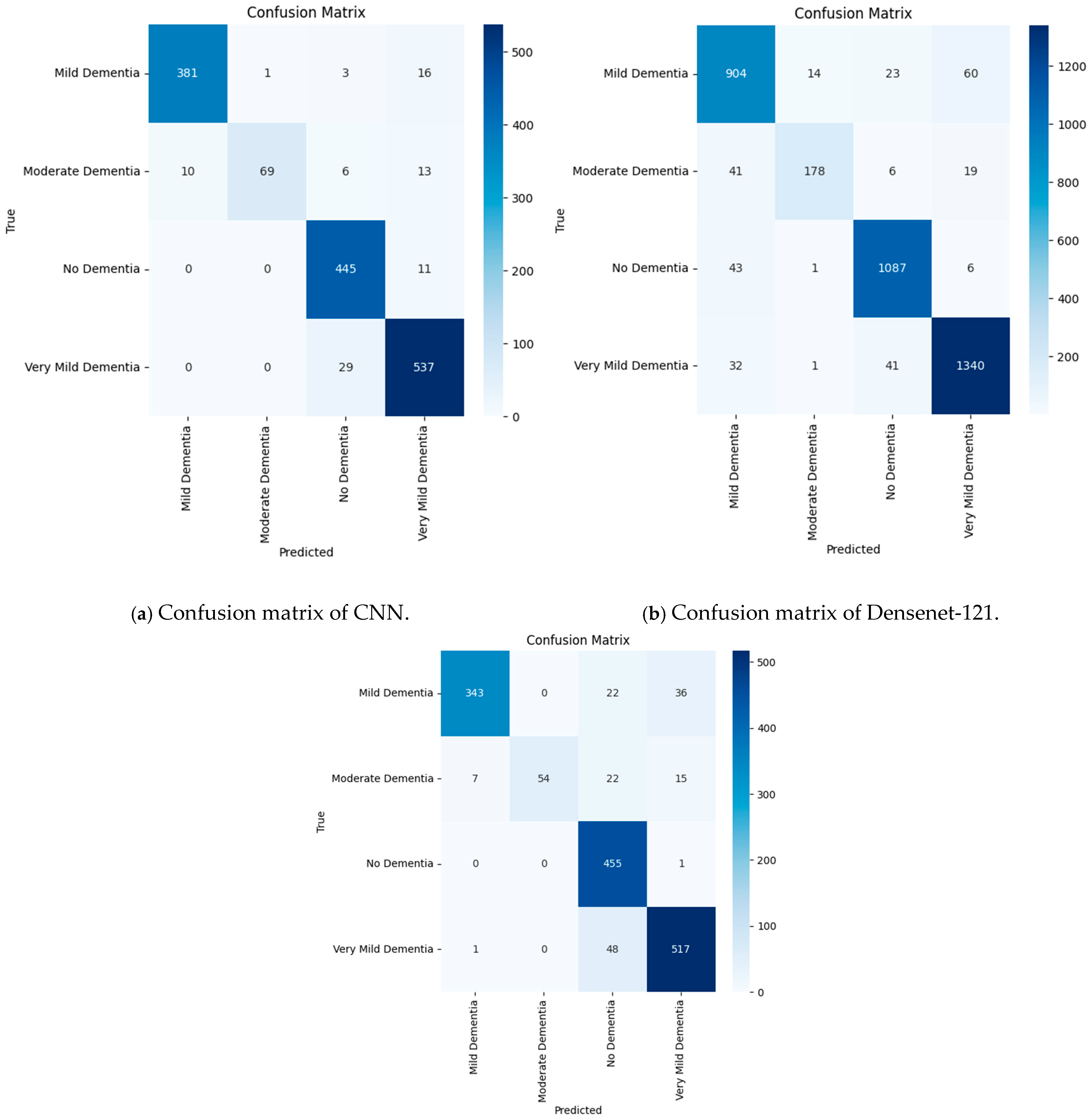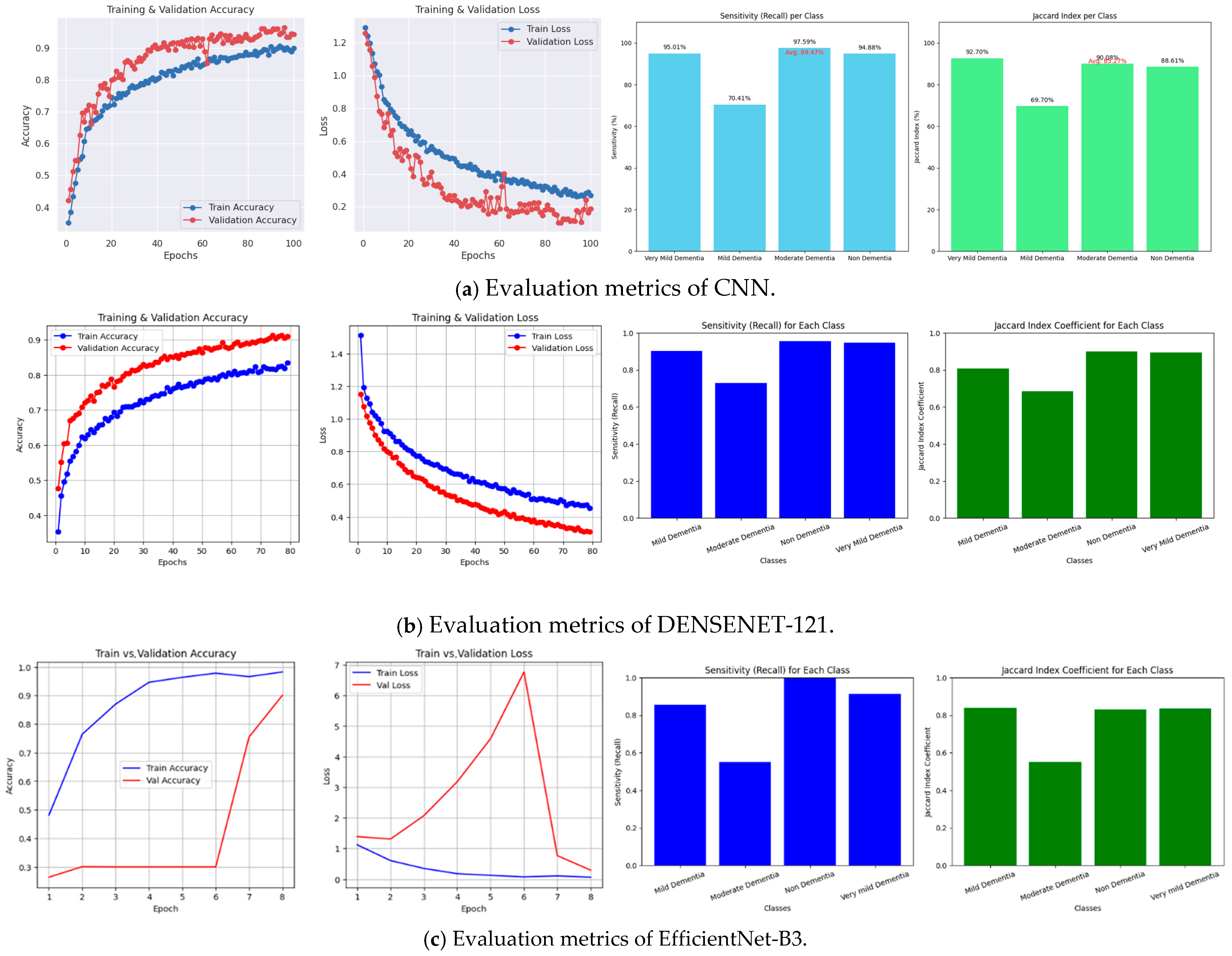 The CNN attained stable convergence without significant overfitting, with consistently high values of recall and Jaccard Index. Dense connectivity allowed denseNet-121 to achieve steady improvement and balanced per-class performance. EfficientNet-B3 performed well in non-dementia detection but showed a significant loss in moderate dementia sensitivity, reflecting the performance in